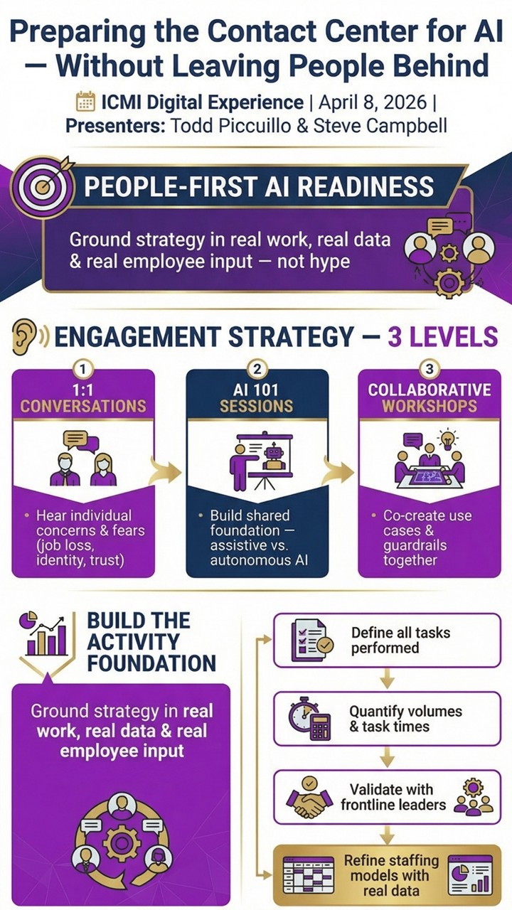 Join Steve Campbell, ICMI Sr. Consultant, and Todd Piccuillo, ICMI Sr. Director, for a discussion on how contact centers can prepare for AI in a practical, human-centered way. We’ll cover how to build an AI roadmap by defining and prioritizing use cases, assessing data readiness evaluating technology options, modeling costs and benefits and establishing clear governance and guardrails.